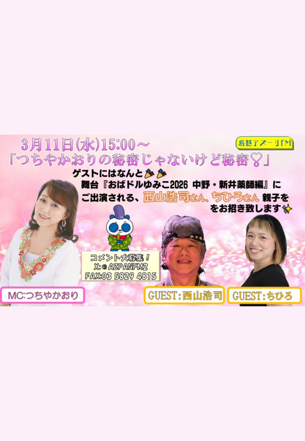 【ラジオ・YouTube】3月11日(水)15時〜鳥越アズーリFM「つちやかおりの秘密じゃないけど秘密❣️ 」に西山浩司・ちひろ親子がゲスト出演します♫•* YouTubeでも同時配信!ぜひ視聴してくださいね♥️