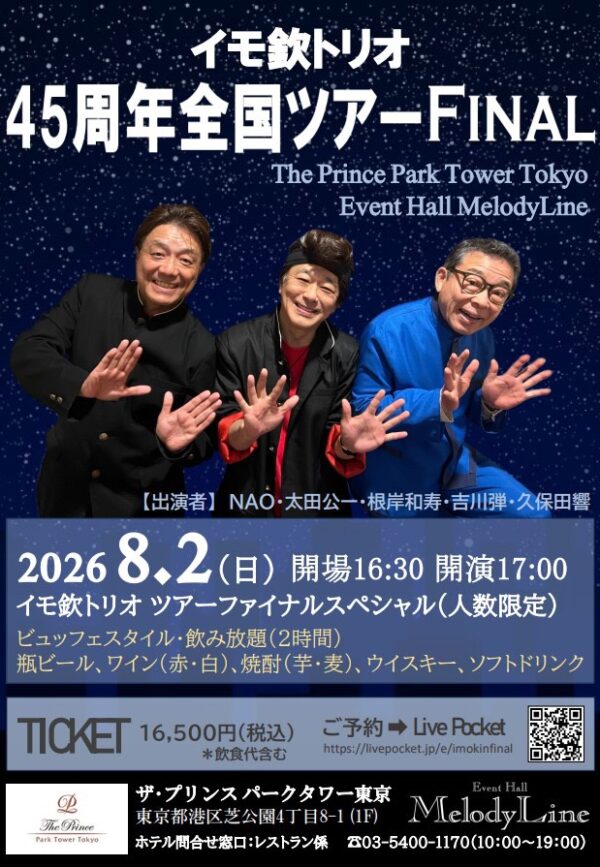 【ライブ】イモ欽トリオ 45周年全国ツアーFINALは8月2日(日)ザ・プリンスパークタワー東京 Melody Line(東京)にて開催決定!!ツアーファイナルスペシャル(人数限定)♪ チケットは5月1日より発売開始です!!お楽しみに♪